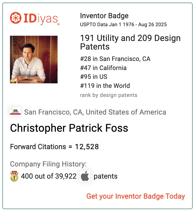 ![]() | Christopher Patrick FossDesigner at Apple. ![]() Patent D1090573 – Display screen or portion thereof with graphical user interface. |