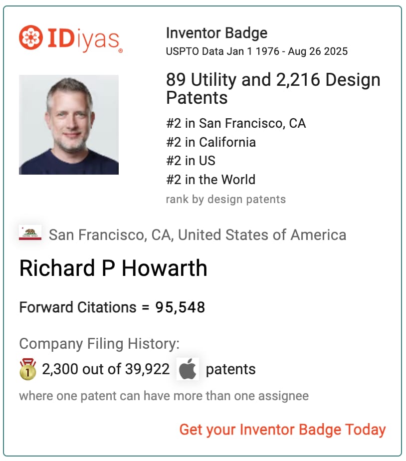 ![]() | Richard P HowarthVice President, Design at Apple. ![]() Patent D1090535 – Front cover for head-mounted display. |