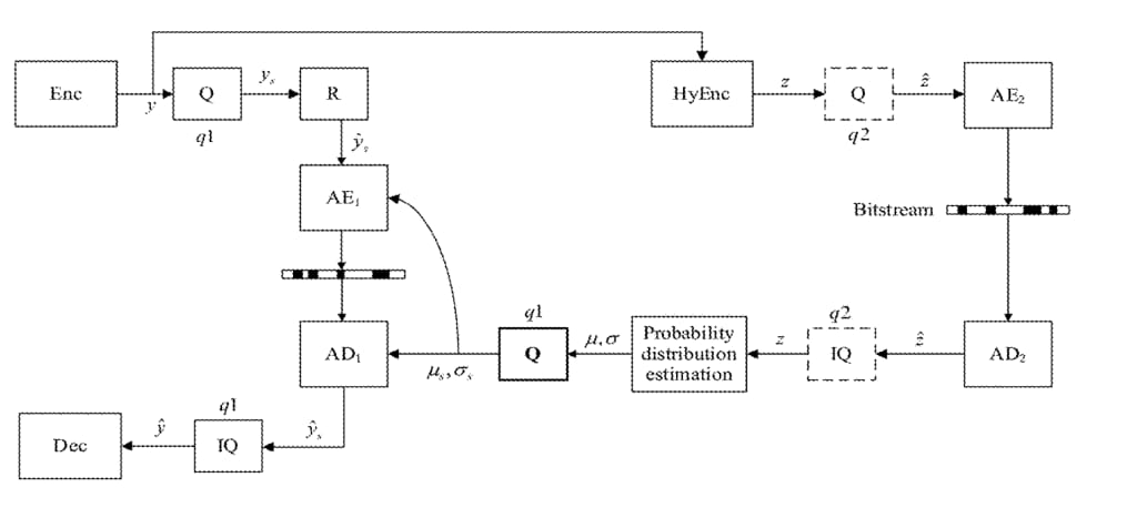 Probability distributions of image features are estimated using a hyperprior: either first estimating the unquantized feature and then quantizing, or directly estimating the quantized feature.