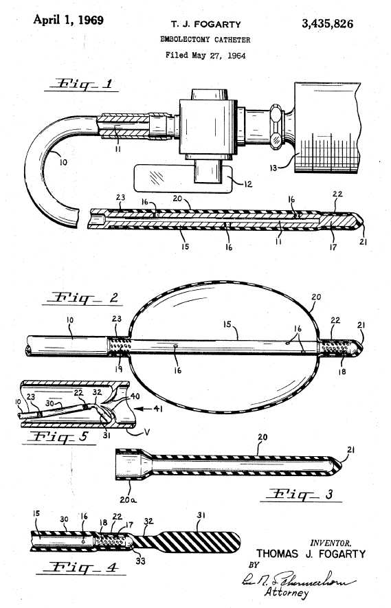 On April 1, 1969, U.S. Patent No. 3,435,826 was granted to Dr. Thomas J. Fogarty for the embolectomy catheter, widely known as the balloon catheter. This groundbreaking invention revolutionized vascular surgery by offering a safer and less invasive method for removing blood clots. Featuring a small balloon at the tip of a flexible tube, the catheter could be inserted into a blood vessel, inflated beyond the clot, and then pulled back to extract the blockage. Previously, clot removal often required high-risk open surgery. Fogarty’s design became a medical standard, saving lives and transforming cardiovascular care worldwide.