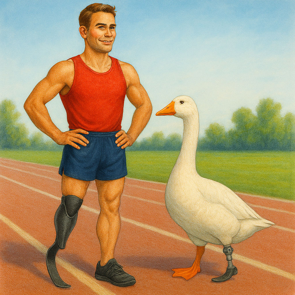 Years later, after his invention had made a global impact, a goose (yes, a real one, waddly and winged) suffered a leg injury that wouldโve been a tragic end for most birds. But thanks to Van Phillipsโ groundbreaking limb design, this goose was fitted with a custom Flex-Foot-style prosthetic and resumed honking, hobbling, and strutting as if nothing had happened.